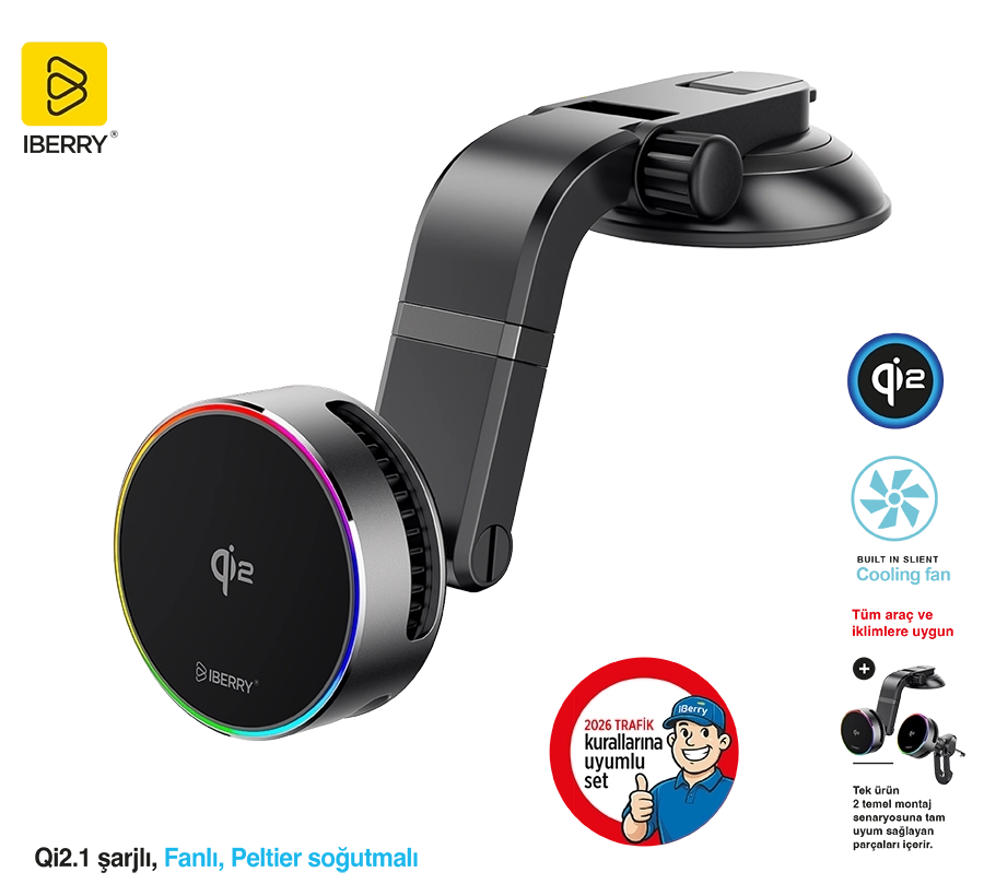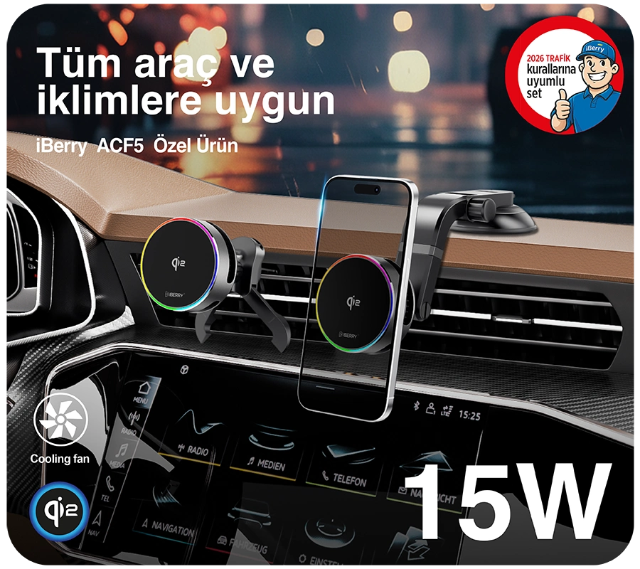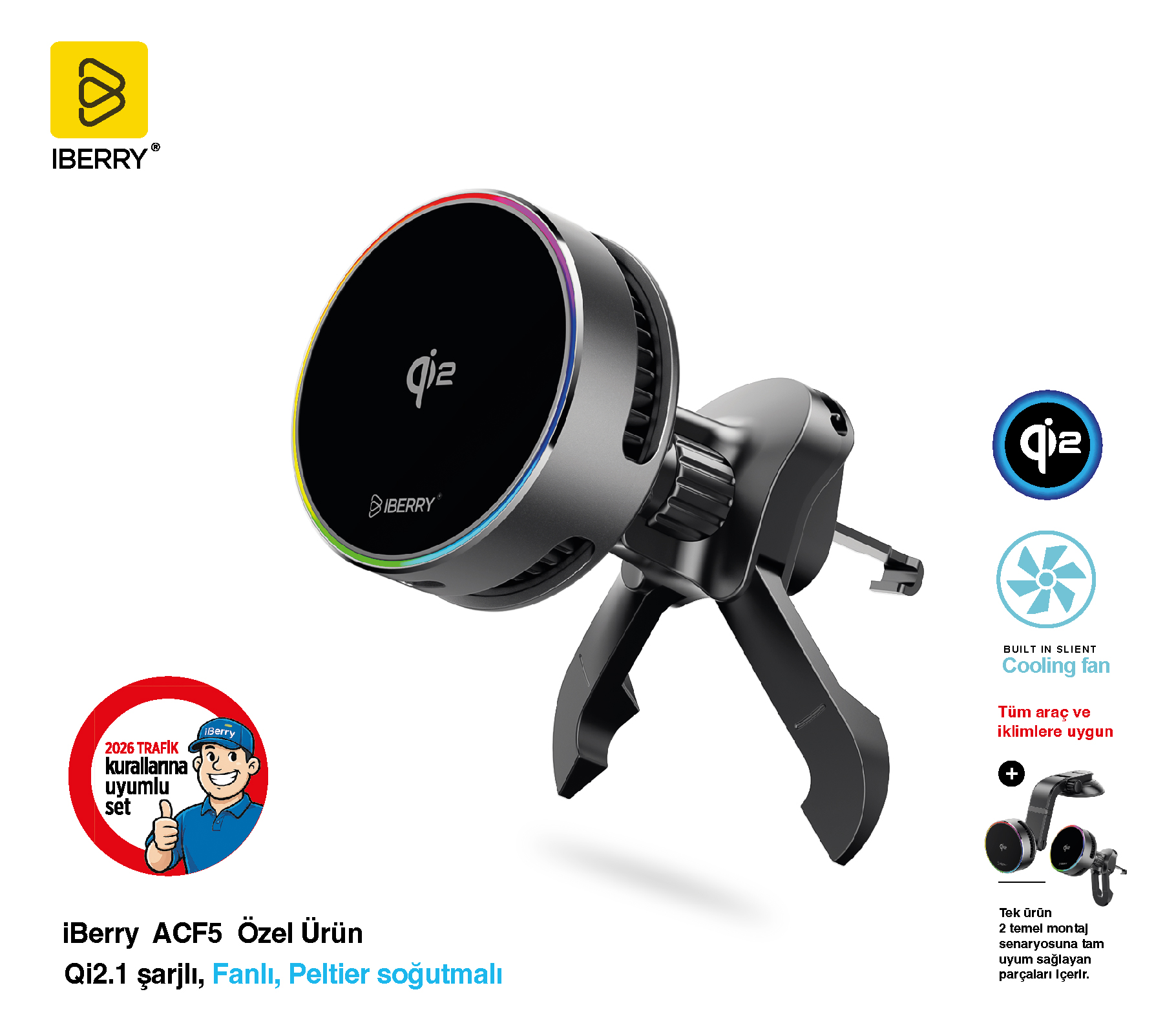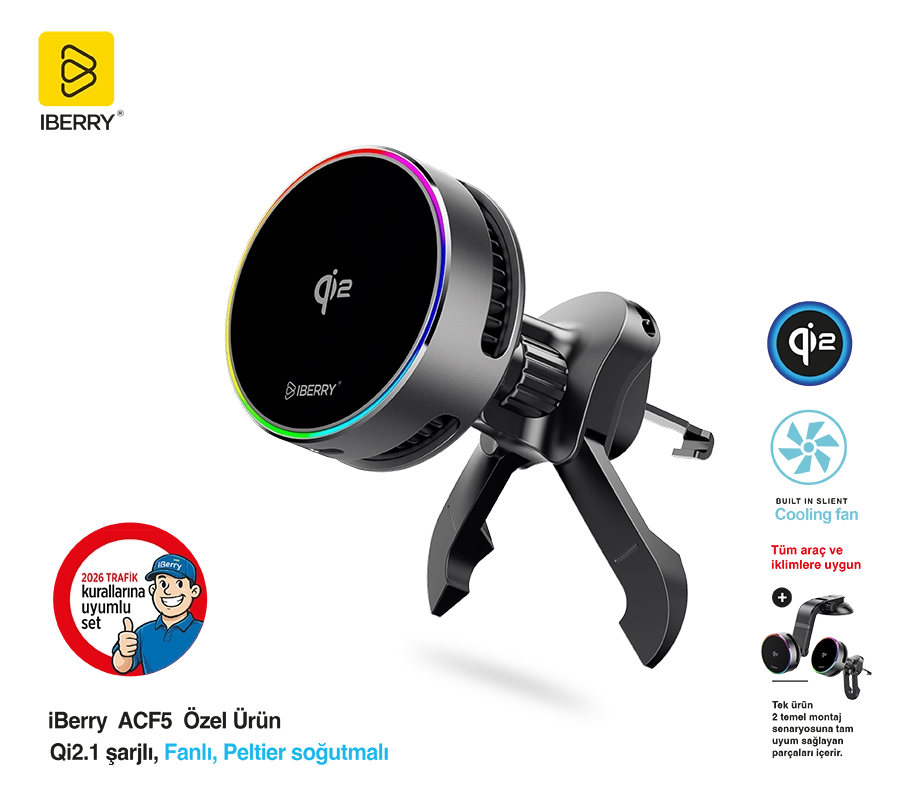iBerry ACF5, araç içinde telefonu güvenli şekilde sabitlemek ve uyumlu cihazları yüksek verimle kablosuz şarj etmek için geliştirilen yeni nesil bir manyetik telefon tutucudur. Qi2.1 teknolojisi, 15W’a kadar kablosuz şarj desteği, Peltier soğutma sistemi, sessiz fan desteği ve güçlü manyetik tutuşu ile günlük sürüşten uzun yol kullanımına kadar daha kontrollü ve konforlu bir deneyim sunar.